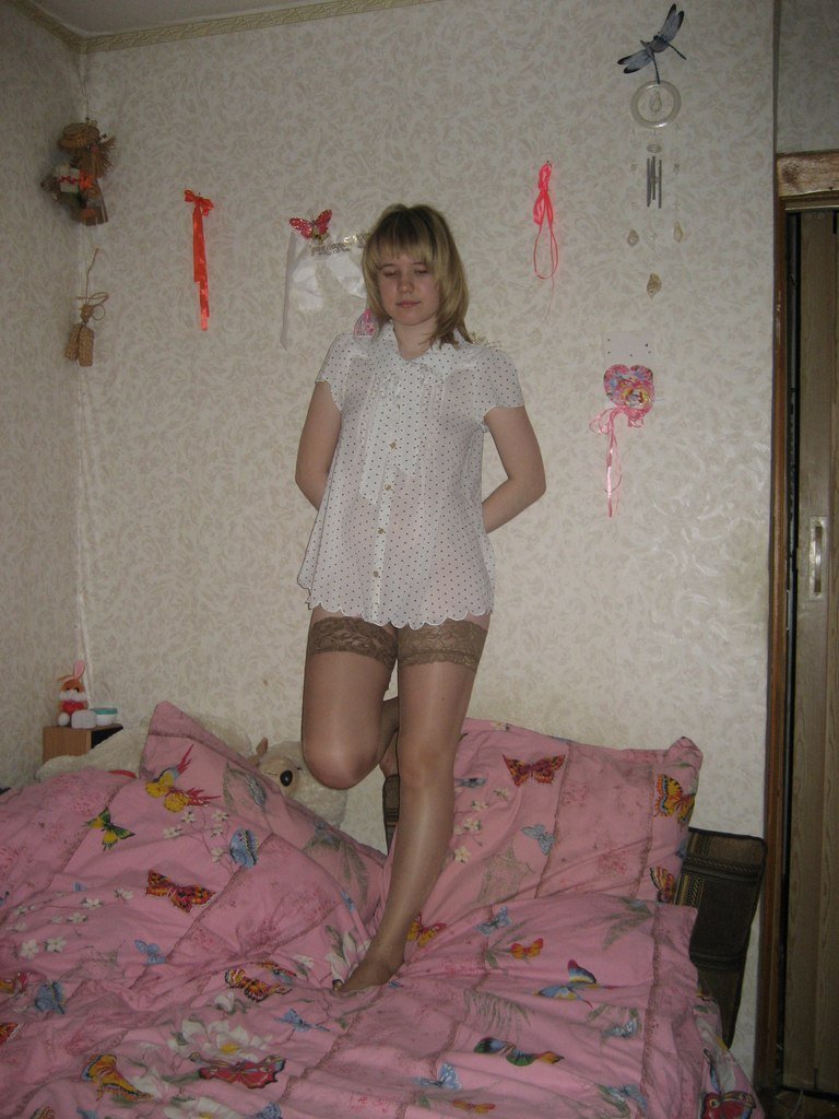 Русская девушка с небольшой грудью и бритой песдой позирует обнаженной. Девица очень любит чулки, и позирует в них дома и на природе.