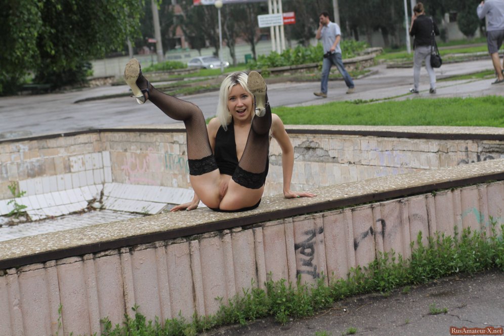 Стройная русская блондинка любит позировать обнажая свои интимные прелести на улице. Она запросто может оголить грудь и снять трусики не обращая внимания на окружающих ее людей.